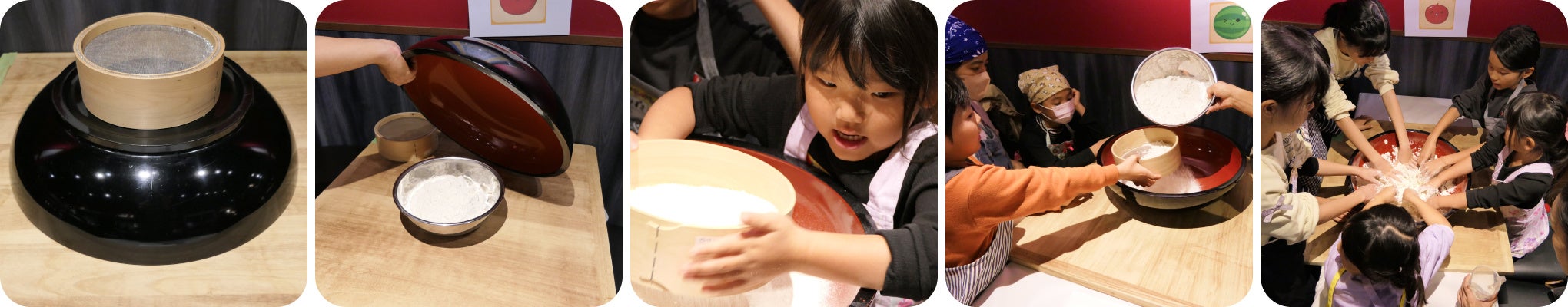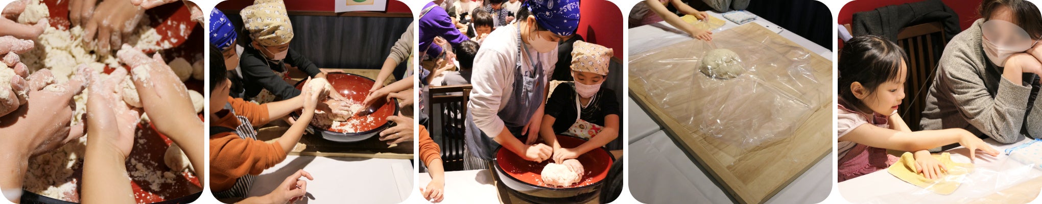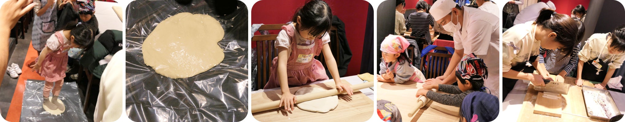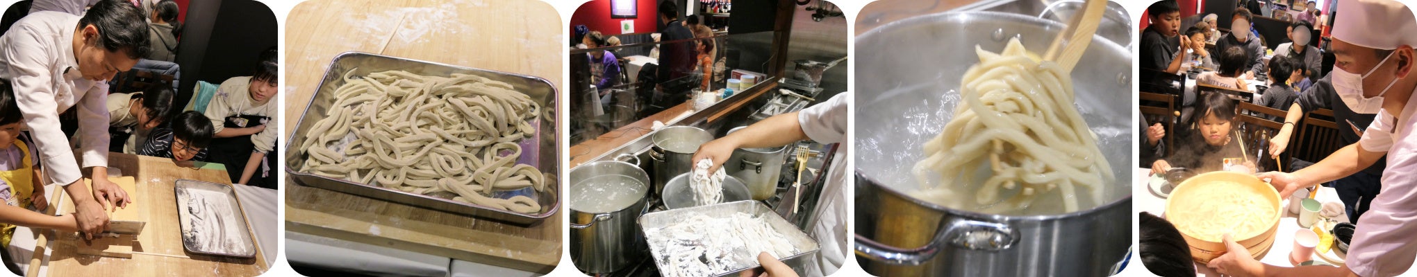 ⇒コシが出るように、みんなで踏み踏み。おいしくな~れ!!⇒最後は大人と一緒に、好きな細さにカット。⇒