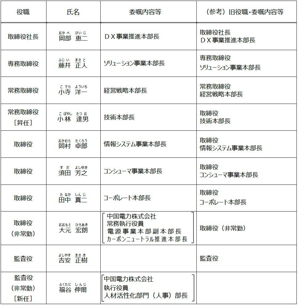 株式会社エネコム(本社:広島市、取締役社長:岡部 恵二)は、本日開催の取締役会において、下記のとおり役員人事および人事異動を決定しましたので、お知らせいたします。