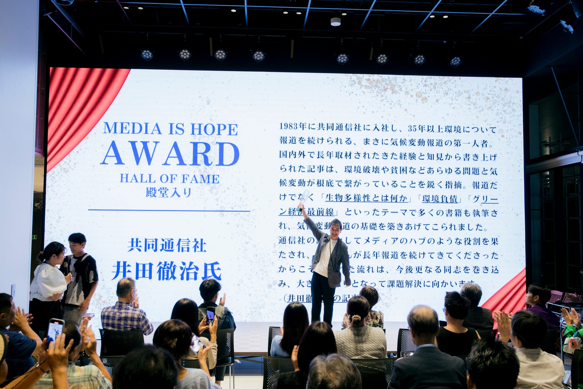 今回初めて、長らく継続して気候変動や環境分野の報道に尽力されてきた国内外のメディア関係者を讃えるため、Media is Hope AWARD「殿堂入り」をお贈りいたしました。