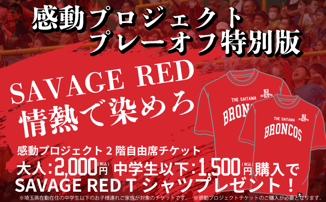 埼玉県に在勤在住のご家族が、中学生以下のお子様と一緒に本チケットでご来場いただくと、ブロンコスプレーオフ特別SAVAGE RED Tシャツをプレゼント!