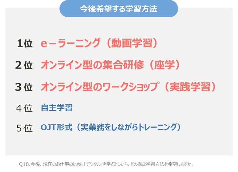 ・今後希望する「デジタルに関する学習方法」は、e-ラーニングによるインプットが中心となっている。