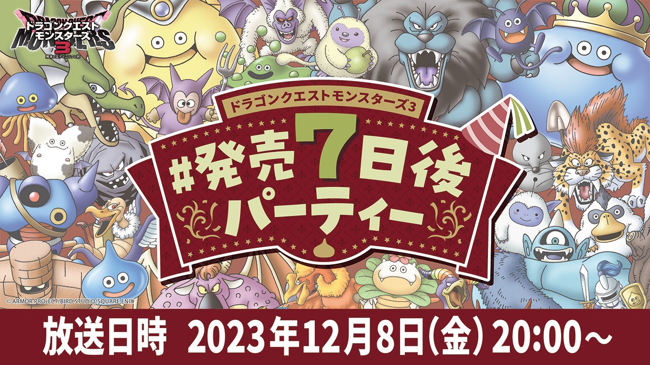 12月1日(金)のソフト発売から7日後となる12月8日(金)には粗品さんをMCに、倉持由香さん、そらるさん、なつめさんちさん、よしなまさんの4組の「ドラゴンクエストモンスターズ」ファンをゲストに迎えたゲーム生配信番組「#発売7日後パーティー」を放送いたします。番組では本作をプレイして完成させたモンスターたちのパーティを披露しながら、4組のゲストが対戦を行います。また、本作のプロデューサーである横田賢人と「ドラゴンクエスト」シリーズの生みの親である堀井雄二さんもイベントに参加。MCの粗品さんとともに、本作の魅力を余すところなくご紹介します。ゲストの個性溢れるパーティや対戦の行方にご期待ください。