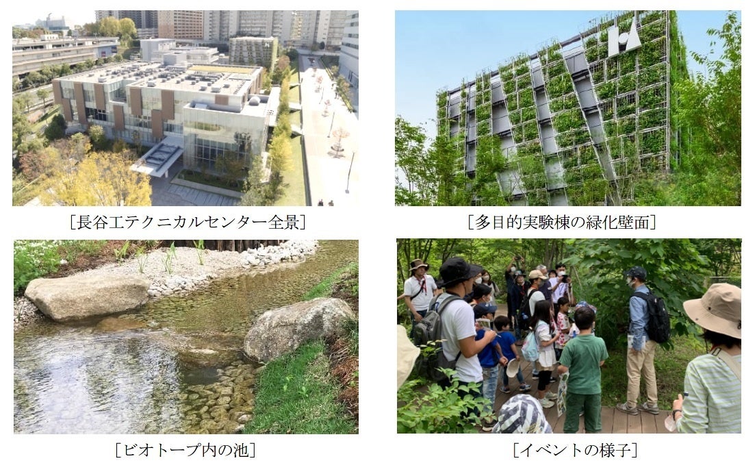 17,662㎡の敷地に4棟の施設を配置し、地上部分や建物の壁面部分・屋上部分などに約8,000㎡(敷地面積の約45%)の緑地を確保しています。また、敷地の中央部にはビオトープを設け、近隣の小川から採捕したアブラハヤやミナミメダカを池に放流しており、2018年3月の竣工以来、多くのいきものが確認できるなど、生物多様性の確保に寄与しています。また、地域住民を対象にイベントを開催し、生物多様性の普及・啓発にも取り組んでいます。