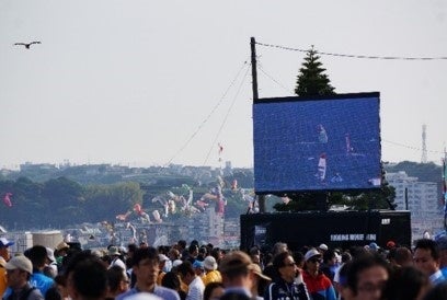 大迫力の海上観戦に加え、陸上では観客との一体感に配慮して沖合でのレースの様子が詳しく分かるように、LED大型ビジョンモニターを設置。船上やドローンからの中継映像を配信します。海上コースの紹介、ルール説明等、観客に分かりやすく伝えられるよう、解説者がタッチパネルモニターに記入した解説図等も大型ビジョンに瞬時に表示します。