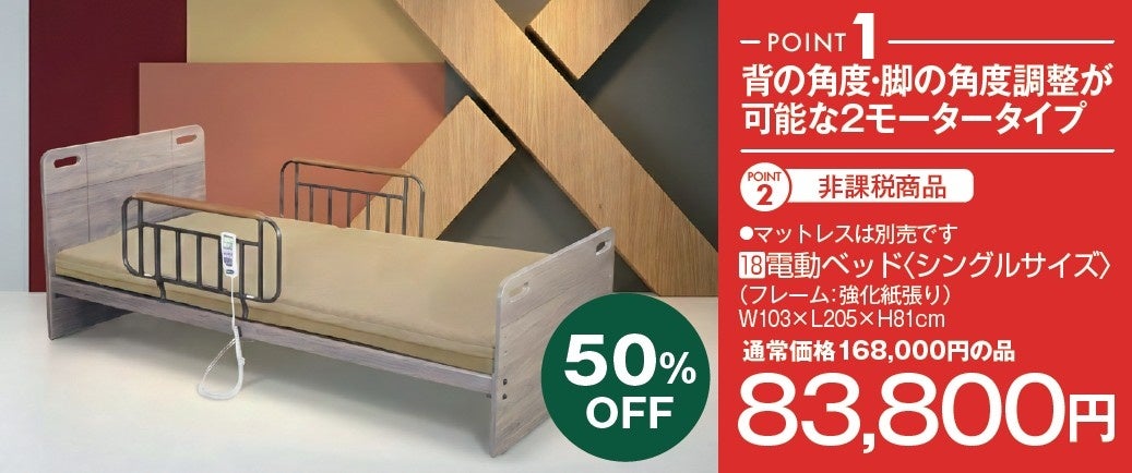 リラックスタイムの読書や、将来の介護用としても需要が高まっている電動ベッド。高機能なマットレス付きのシングルサイズ(非課税商品)