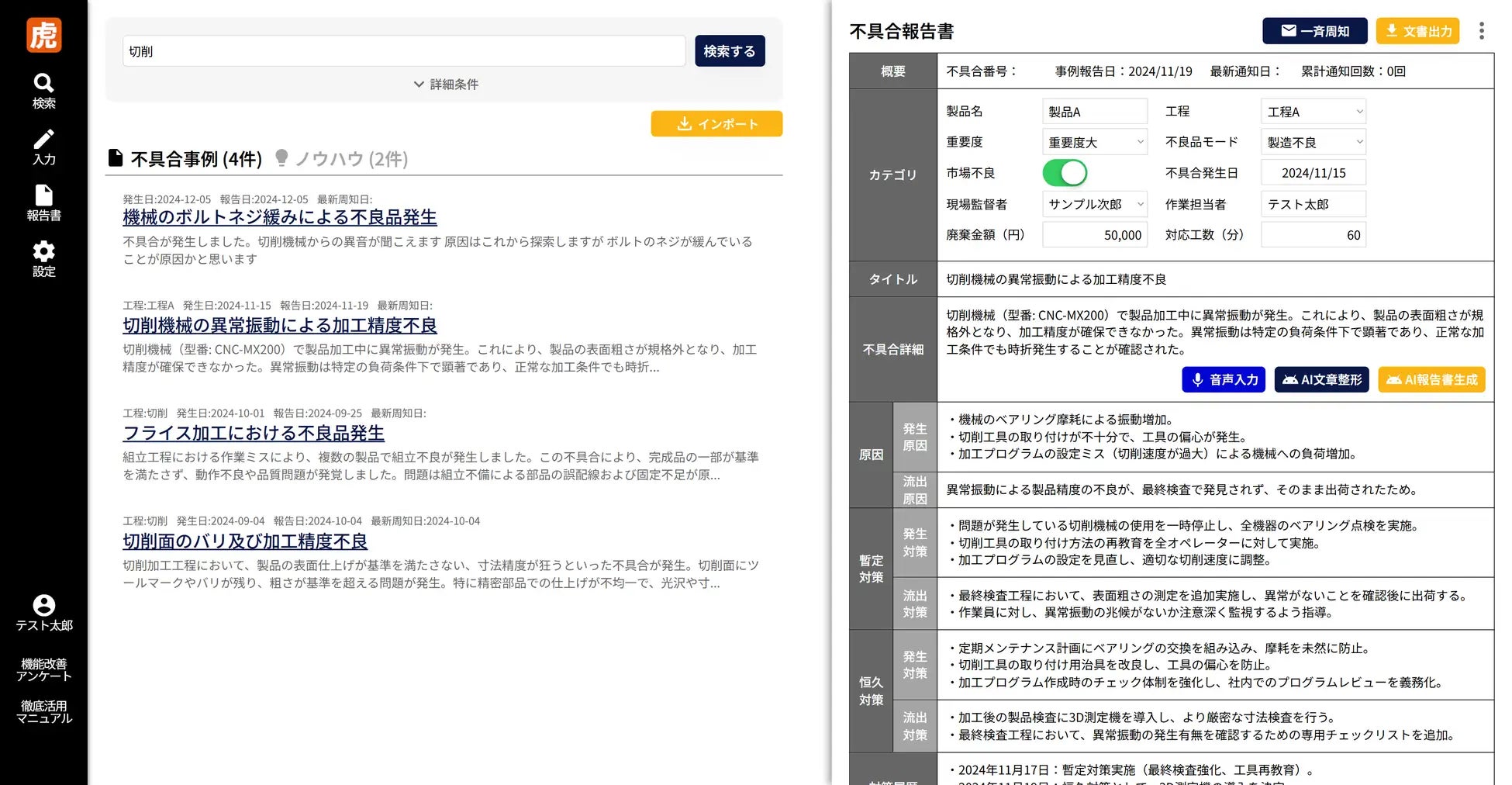 事例の概要を話すだけで、過去事例データを学習したAIが原因や対策を自動入力。要約機能も搭載されており、どなたでもスピーディに正確な報告書を作成できます。