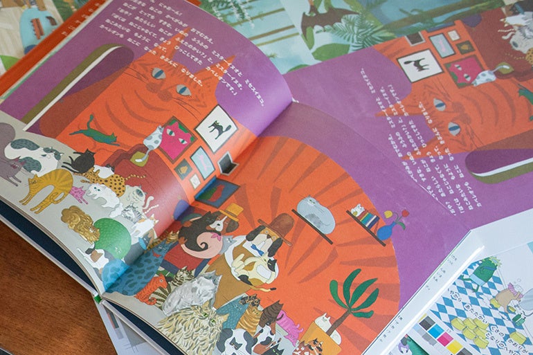 この絵本にはたくさんの動物たちが登場しますが、自分が話しかけたくなるような雰囲気を意識して、それぞれのキャラクターを個性的に描きました。登場人物とインテリアと壁紙、3つの要素を描き分け、私としては珍しいカラフルな色表現にチャレンジできた作品でもあります。絵本を手に取ってくれる皆さんに、お部屋の壁紙の楽しさと、自由が伝わるとうれしいです!