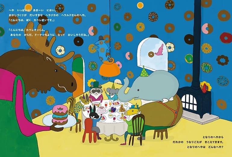 絵本「カベレオンの となりのへやはどんなへや?」の物語は、カベレオンが動物たちの住むシェアハウスに引っ越してくるシーンで幕を開けます。