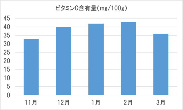 金柑の出回り期である11月~3月にビタミンC含有率を測定してみると、2月に最も高くなる傾向が見られました。*デリカフーズグループ測定データ(2010~2019年)n=10