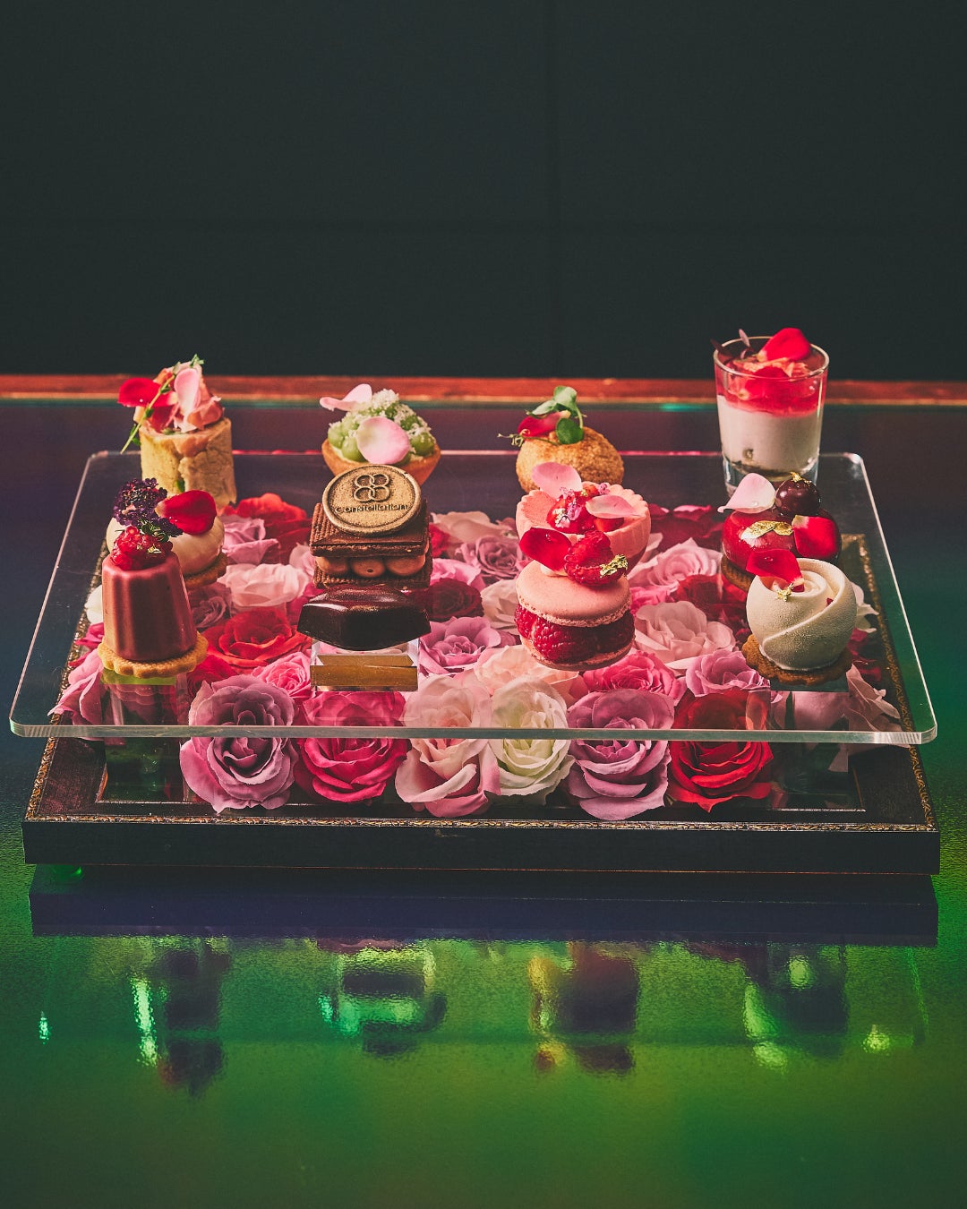 薔薇が敷き詰められたプレートの上に宝石のように美しく彩られたスイーツ達。