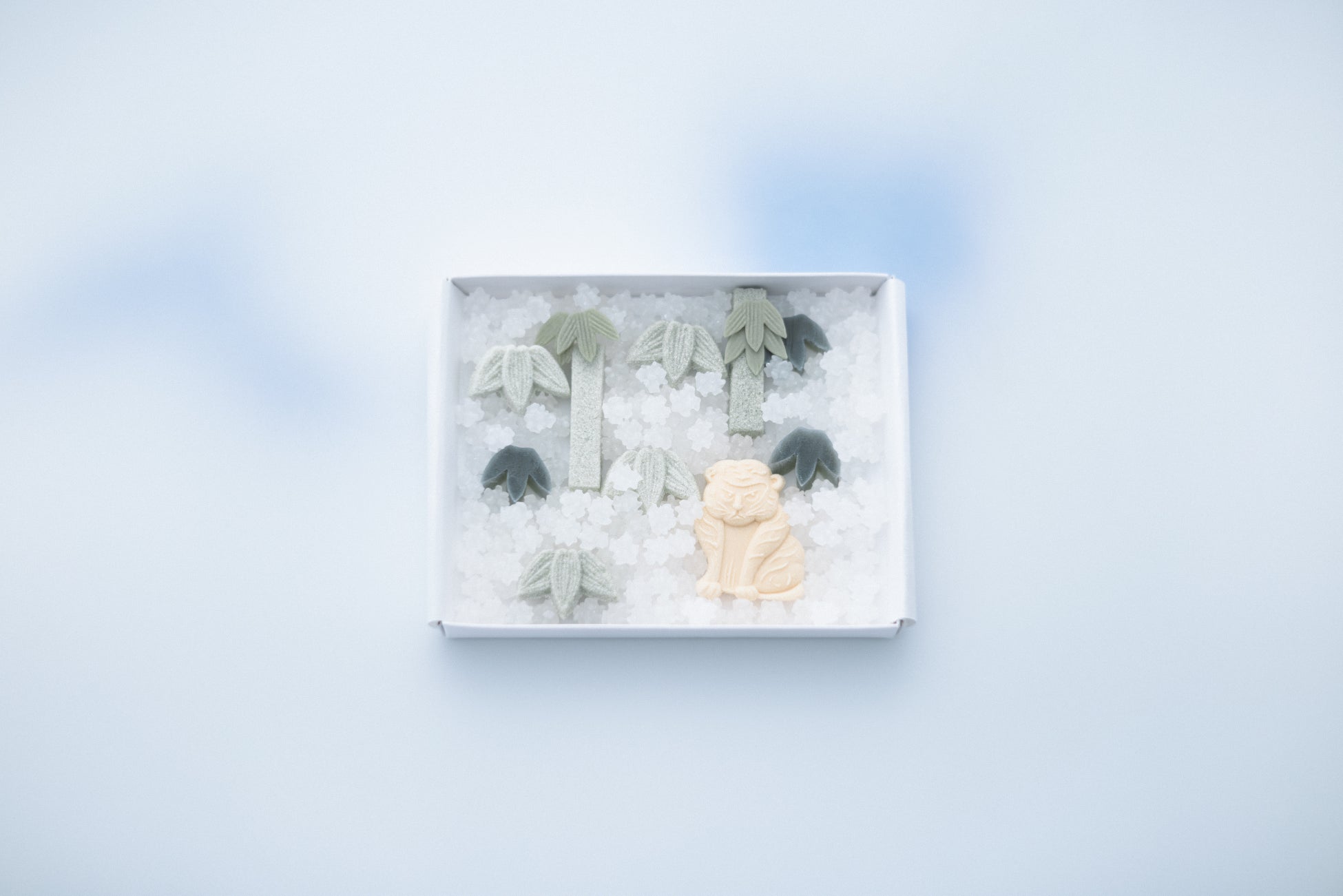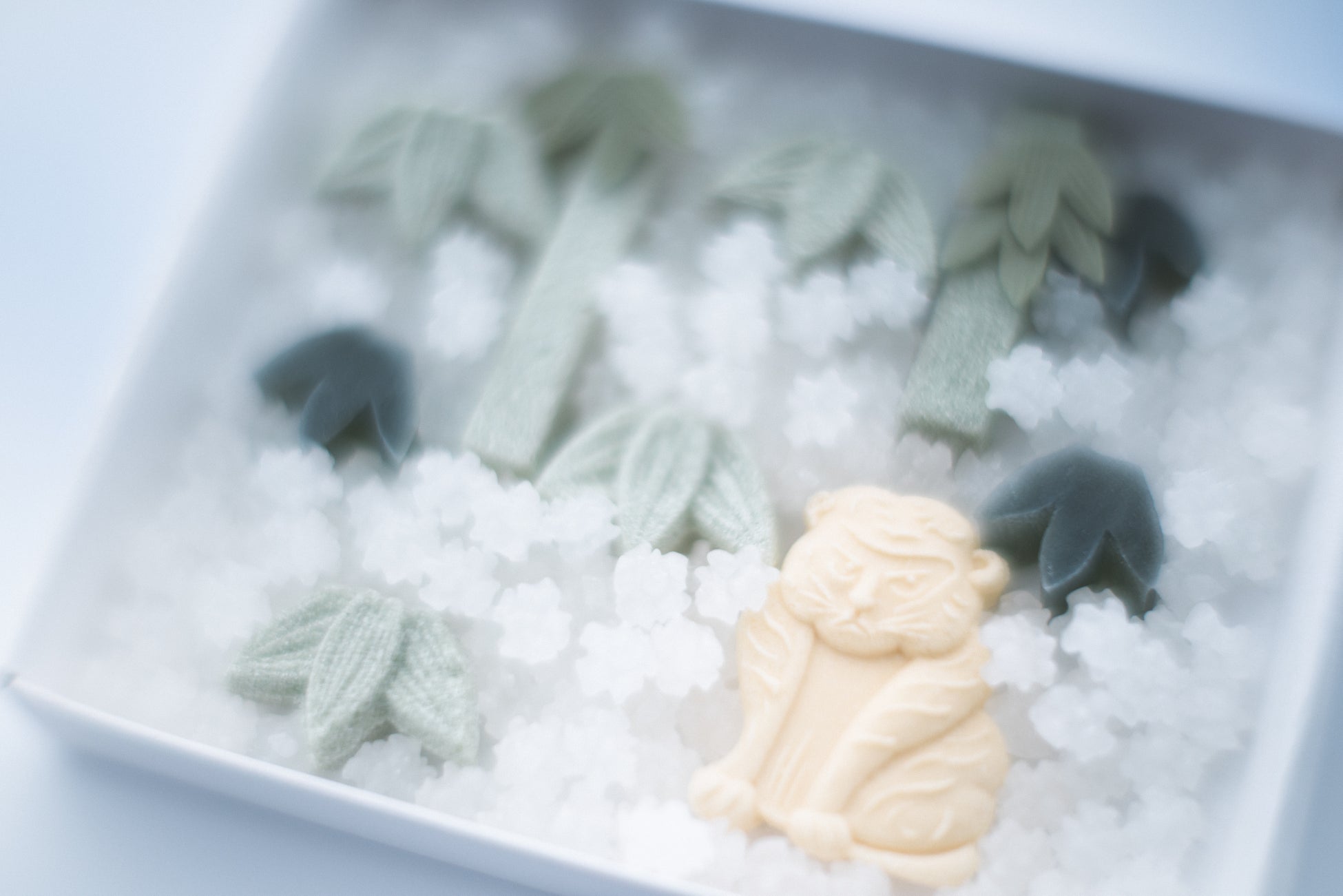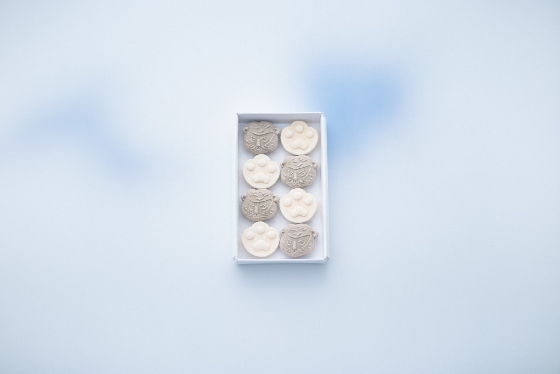 京都国立博物館の公式キャラクター”トラりん”。 尾形光琳の「竹虎図」がモチーフのキャラクターです。竹虎図の虎は、いたずらっ子のようなやんちゃな眼をして睨んでおり、愛嬌たっぷりな表情で描かれています。また、「琳派」という言葉は尾形光琳の「琳」からとられており、京菓子と関連が深く、その美意識は、和菓子の意匠に影響し、季節感や自然を巧みに表現する繊細な造形となり、今日まで受け継がれています。そんな京菓子と関連が深い親を持ち、魅力たっぷりな”トラりん”を干菓子で表現しました。