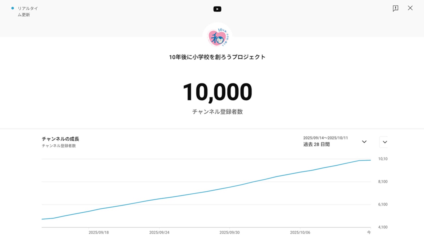 クメンタクリニックの公式YouTubeチャンネルである【10年後に小学校を創ろうプロジェクト】は、2025年10月12日にチャンネル登録者1万人を突破。