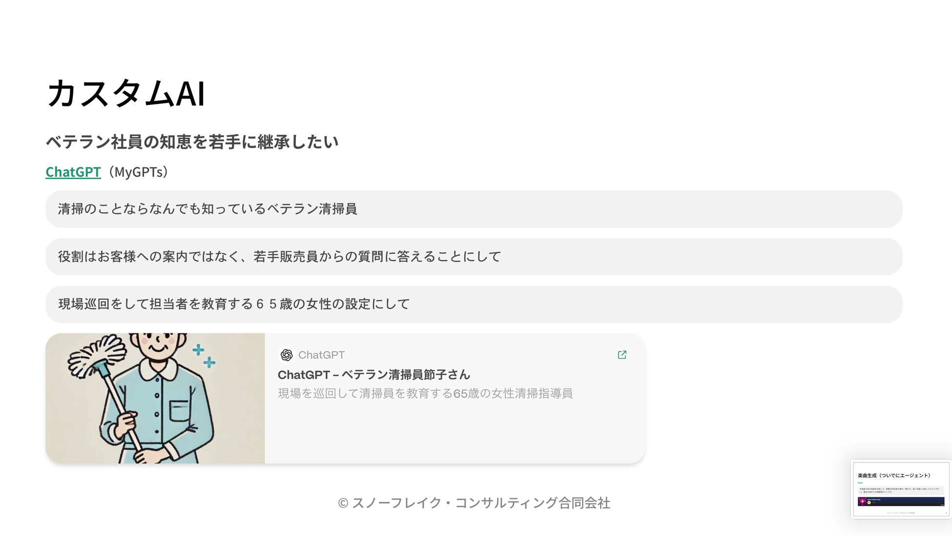 ベテラン知恵の継承: 「清掃歴40年のベテラン節子さん」という人格をAIに設定し、若手社員が気軽に現場のノウハウを相談できるチャットボットを構築。
