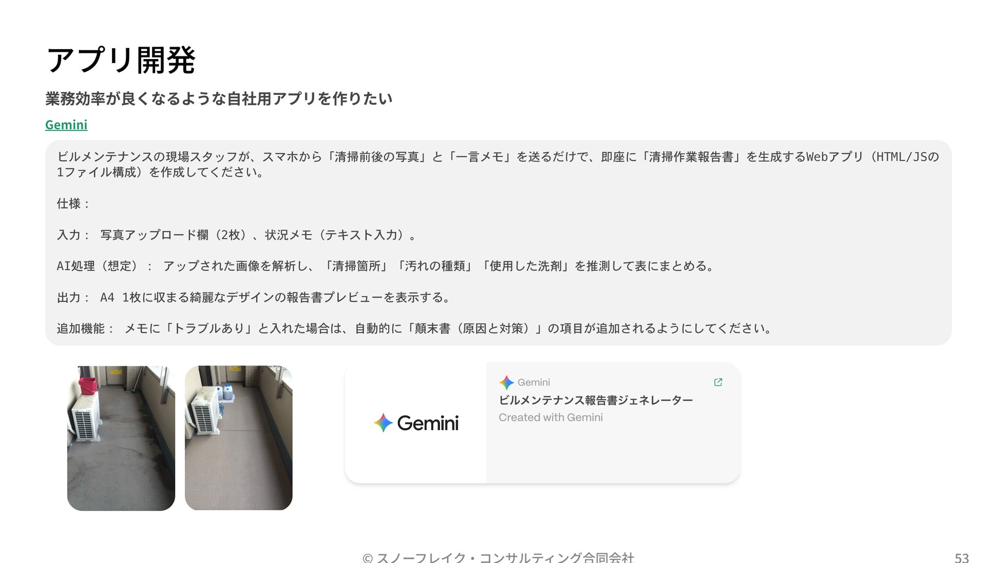 ノーコード・アプリ開発: プログラミング知識ゼロの状態で、「現場報告用のアプリを作って」とAIに指示し、写真アップロード機能付きのWebアプリをその場で生成。