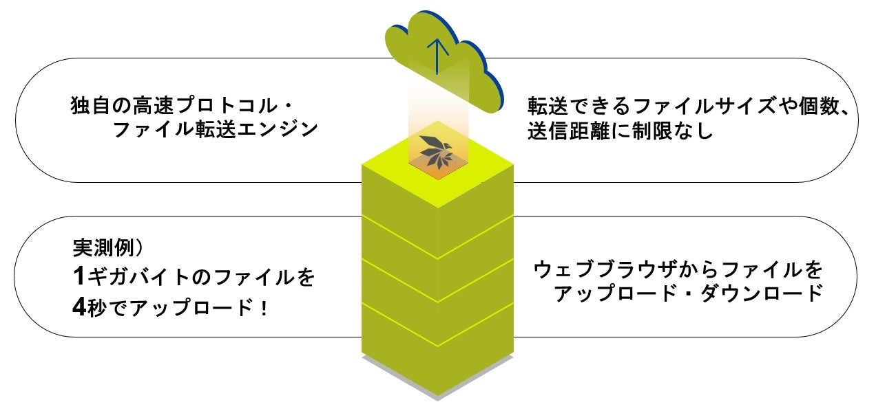 独自の高速プロトコル/ファイル転送エンジンにより、ファイルサイズや個数、送信距離に制限なく大容量ファイルの高速転送を実現します。