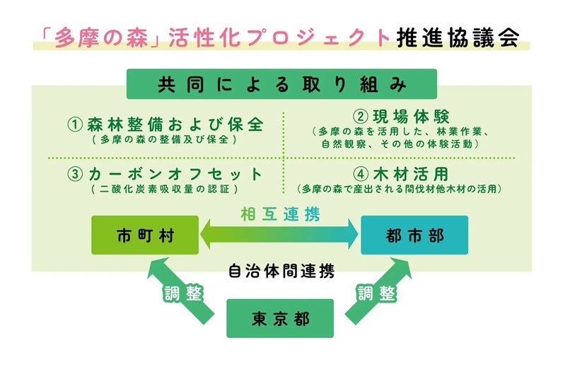 都民にとって必要不可欠な多摩の森を守るために、森林を持たない特別区と森林を持つ多摩地域の市町村および、東京都の14自治体が連携して、持続可能な森林循環の確立に向けた広域的な取り組みを推進します。