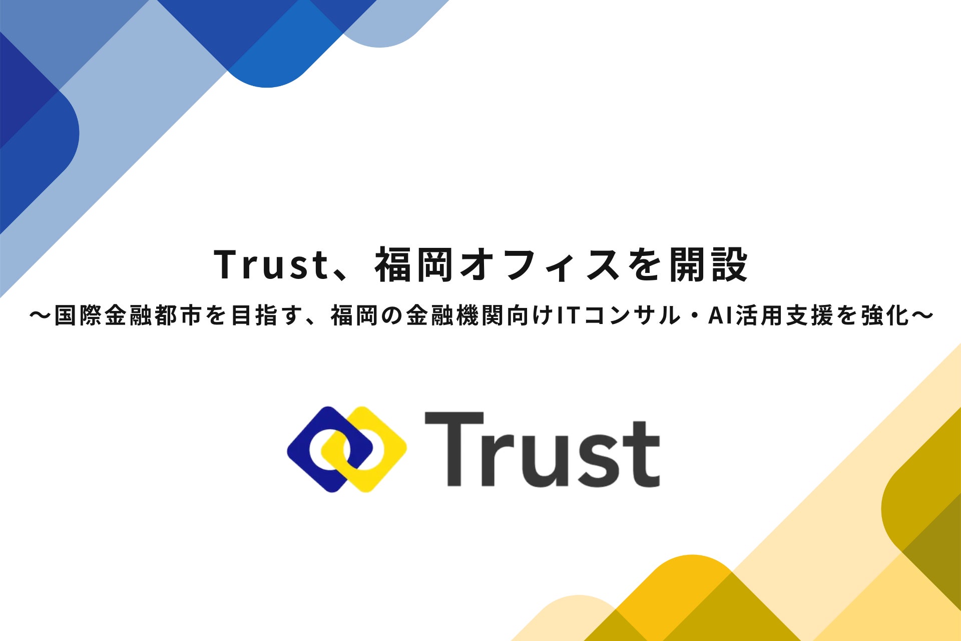 「テクノロジーとコミュニティーで金融の未来を創る」をミッションに掲げるTrust株式会社(本社:東京都中央区、代表取締役社長:友田恭輔、湯山敬太、以下「Trust」)は、この度、福岡エリアの金融機関に対するITコンサルティングおよびAI活用の支援体制を強化することを目的とし、福岡オフィスの開設を決定いたしました。