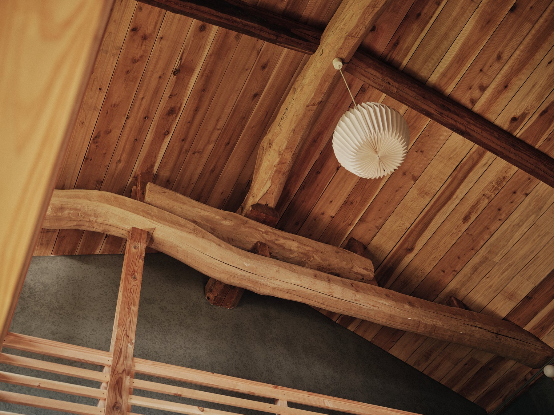 かつての農具や梁がアートのように再構築され、記憶がデザインとして息づく空間。 -