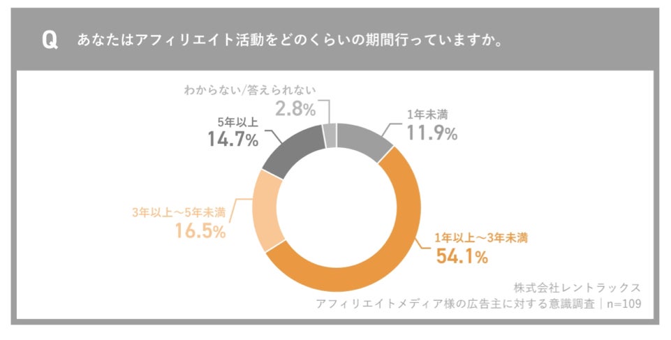 この課題に対処するには、まずアフィリエイトメディアの実態を正しく理解することが大切です。当社(レントラックス)が 2024 年に実施した最新の調査によると、アフィリエイトメディアの54.1% が「1 年以上3 年未満」の活動経験を持っていることが分かりました。