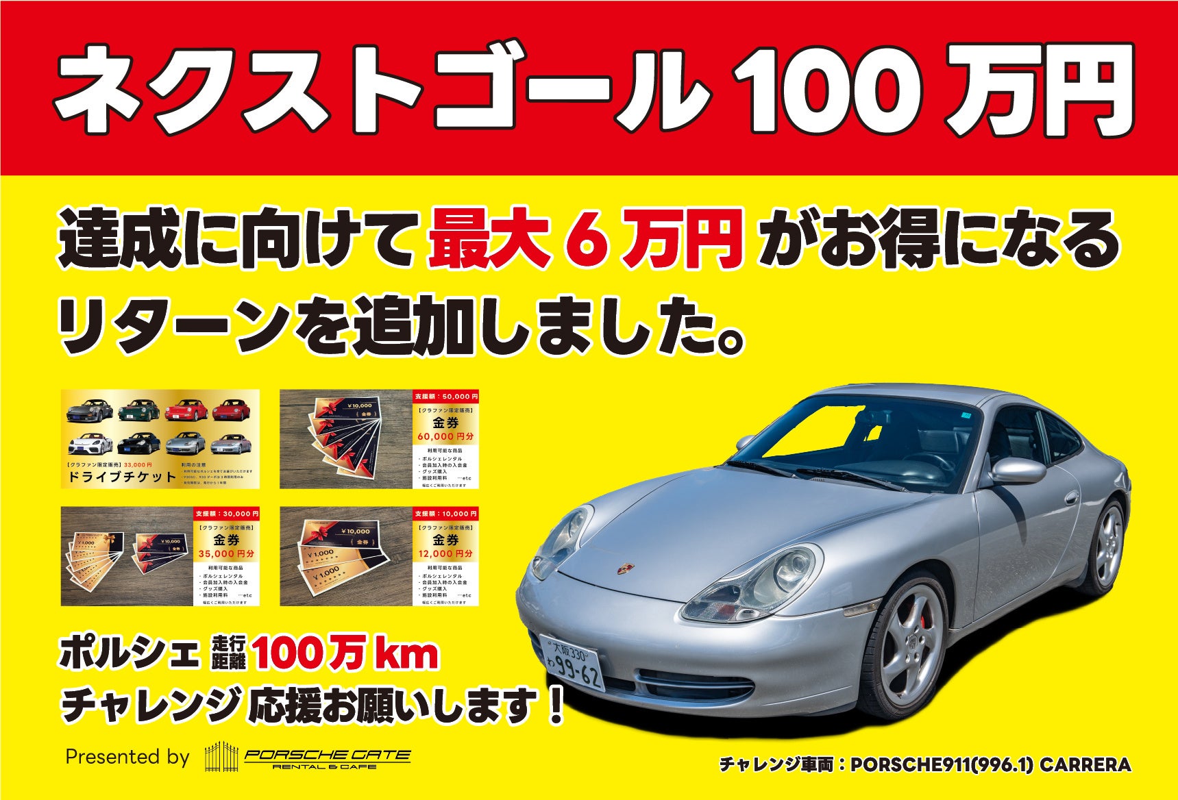 株式会社ドリームゲートは、ポルシェ996走行距離100万kmチャレンジの一環として行っているクラウドファンディングのネクストゴール達成に向けて最大6万円がお得になるリターンを追加いたしました。