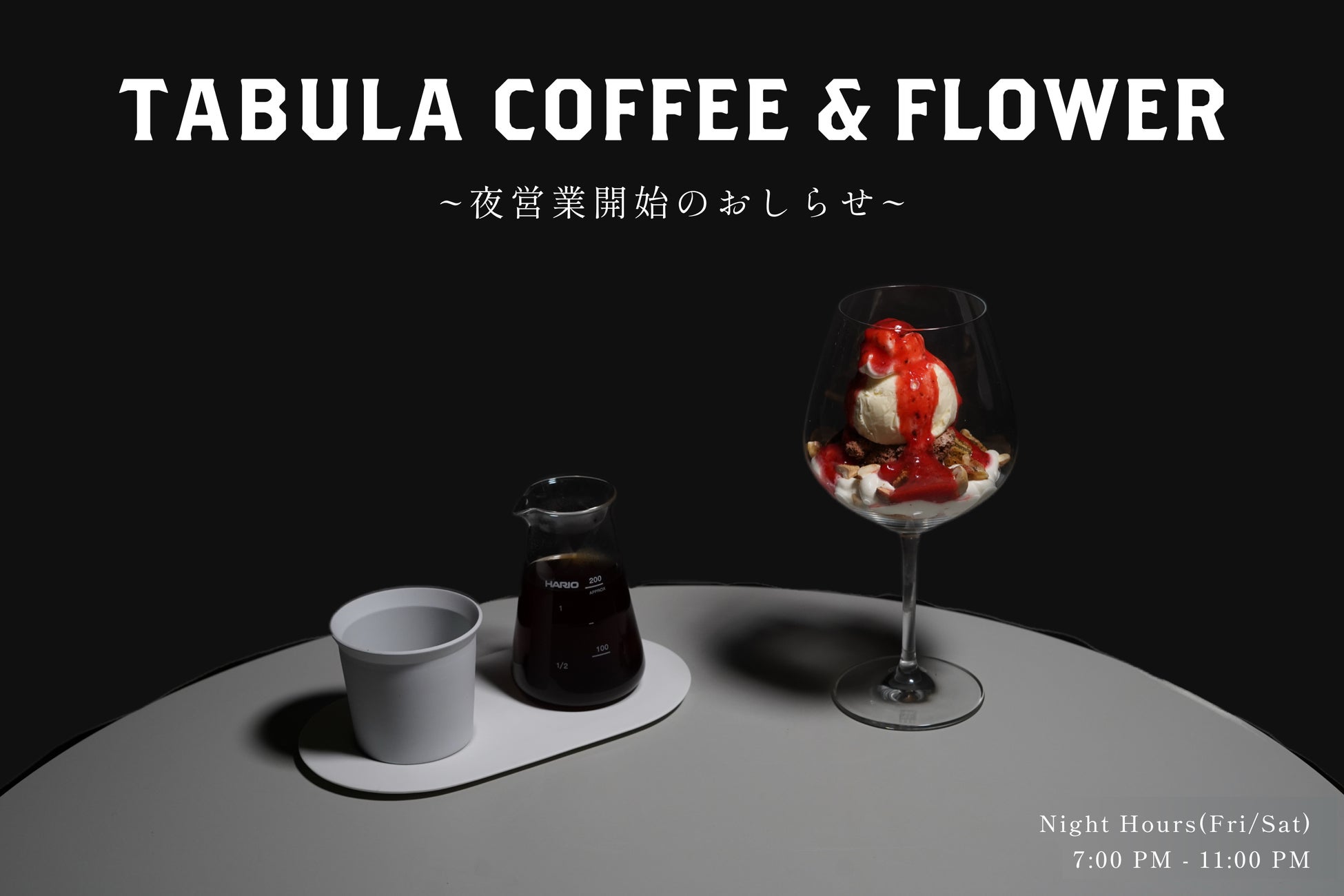 穏やかな昼間とは一味違う、特別な夜のTABULA。花とコーヒーが織りなす癒しの空間で、心地よいひとときをお過ごしください。