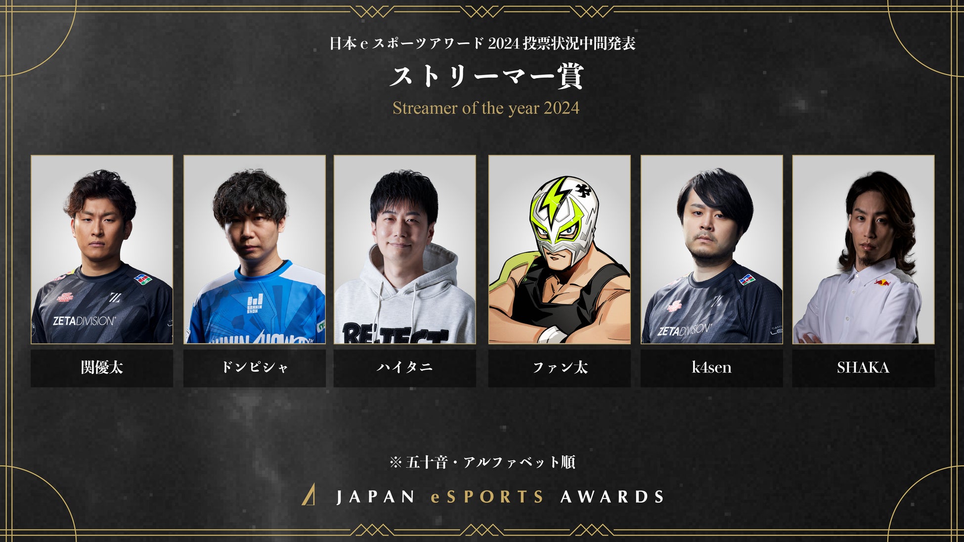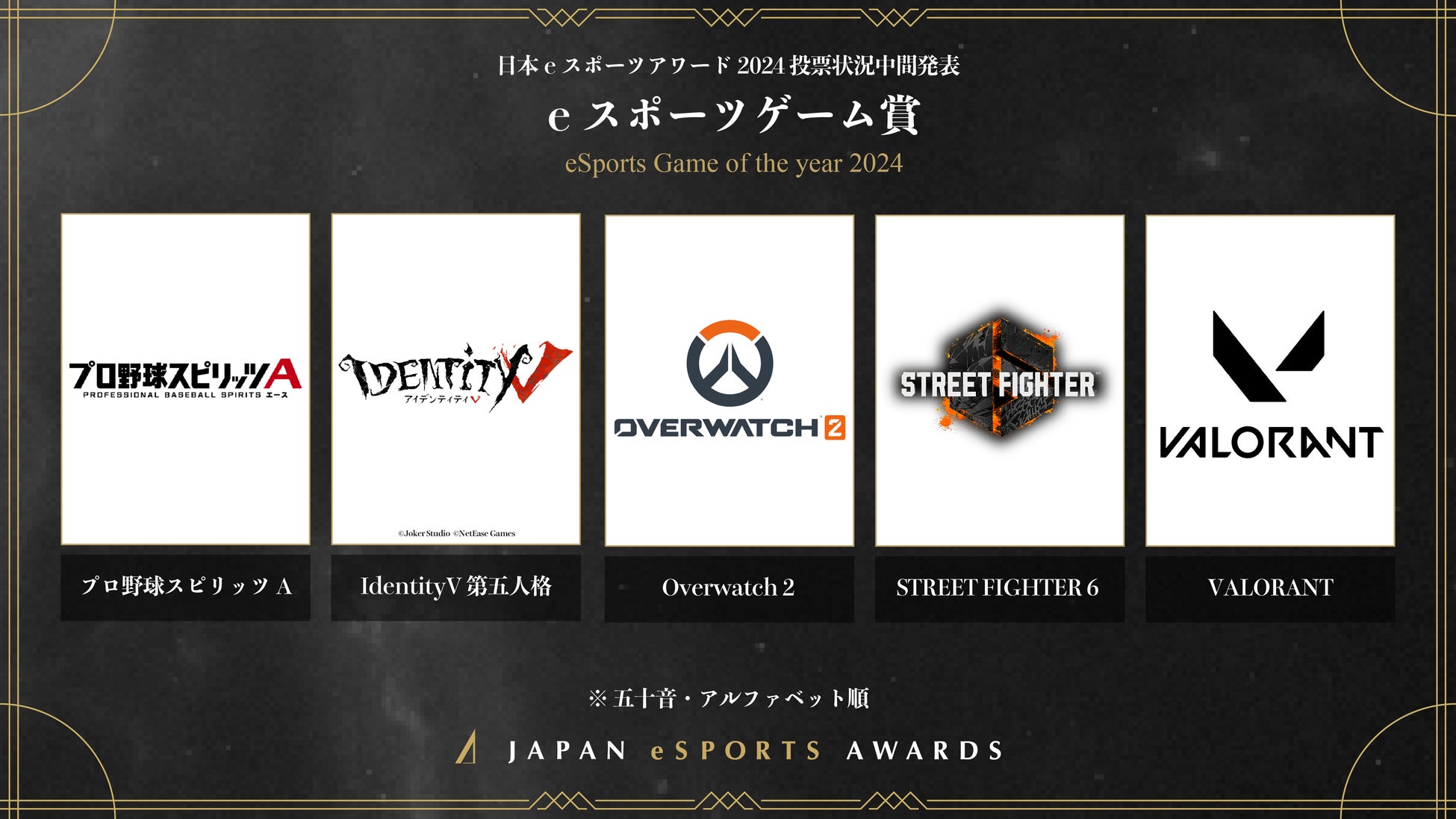 一般社団法人日本eスポーツ連合(会長:早川英樹 以下、JeSU)は、2025年1月15日に開催する、「日本eスポーツアワード2024」のファン投票について、中間結果をお知らせします。ファン投票は9月1日より受付を開始しており、約2か月間の集計結果となります。
