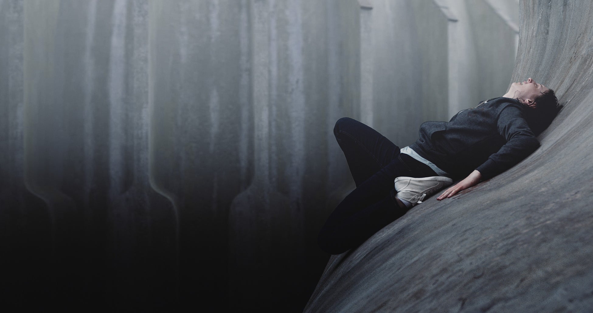 女が目覚めると暗くて急な斜面の突起部分にいた。捕まるものもなく、彼女は手のひらの摩擦だけで体を支えるしかない。必死で張り付いていると今度は足元の暗闇から不気味な音が聞こえてきた。