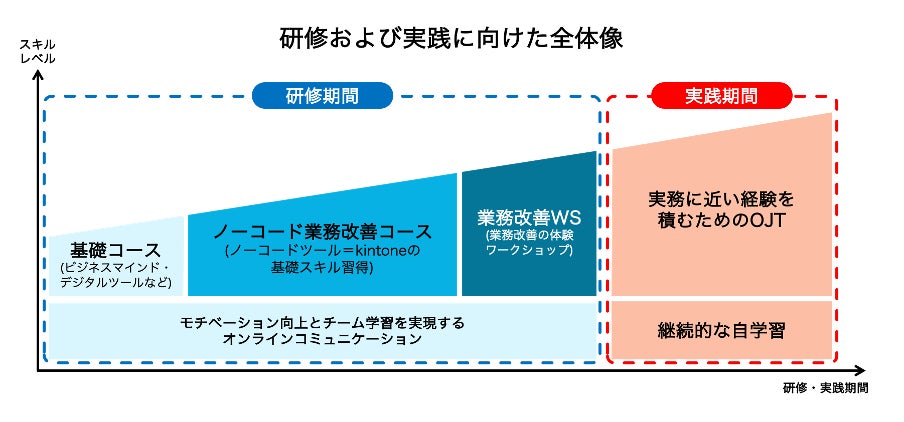 ● kintoneを利用した業務アプリの開発演習・日報アプリの作成・簡易的なデータ分析などを実践し、「ノーコードを使いこなし、業務改善提案ができる」レベル(※2)までスキルを習得。
