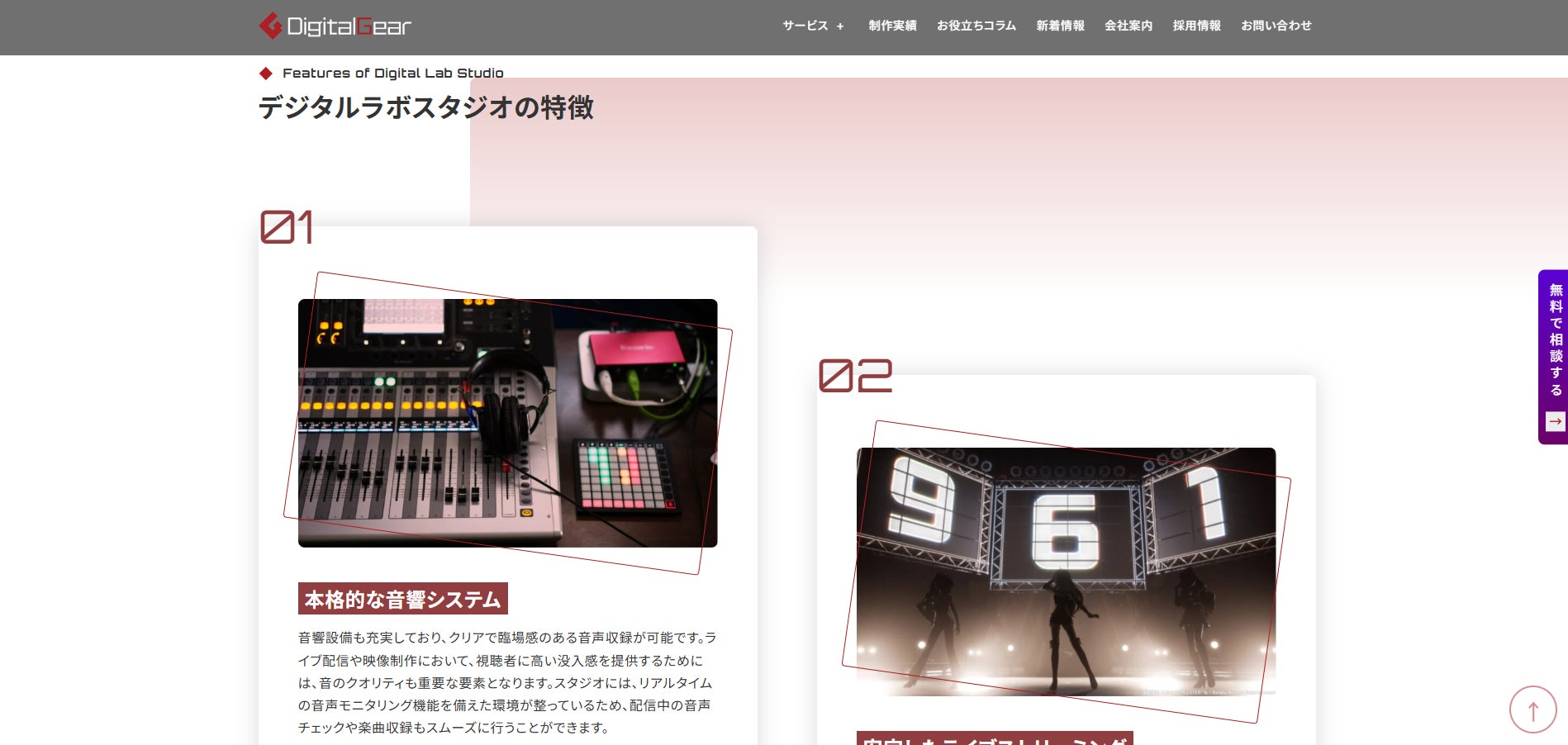 サービスページでは、当社の主要サービスを 「VTuber制作・運用支援」 と 「デジタルラボスタジオ」 に整理しました。VTuber制作・運用支援では、キャラクターのデザインから3D モデリング、配信時の演出までをトータルサポートし、運用開始後もコンテンツ企画やライブ配信など継続的な支援を行います。デジタルラボスタジオでは、モーションキャプチャースタジオを活用し、実際に動かしながら品質検証ができる制作環境を提供します。