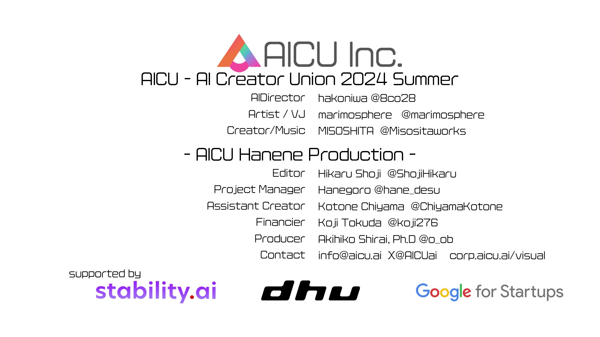 AICU Visual Communication is a virtual production company that can organize new talent to create fresh visuals using cutting-edge AI technology. We are a Japan-based international production company that shares the vision of "creating people who create," and works with advanced individual creators, specializing in the use of advanced AI, incredible speed (It was 7 days work for curation and production), pipeline construction, and fascinating expression techniques. Working with individual creators, while collaborating with AICU media, AICU AIDX Lab and other technical productions, Stability AI, Digital Hollywood, Google For Startups, and other startup support, We are pioneering the next market for professional video production.
