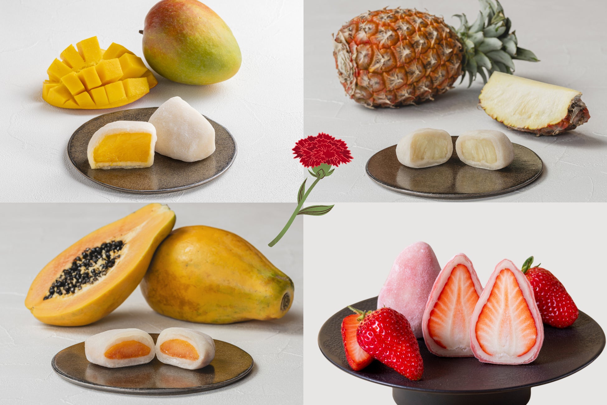 本セットには、母の日用に特別にご用意した、カーネーションを表現したピンク色の求肥のいちご大福をはじめ、太陽の恵みをたくさん浴びて育った完熟の国産マンゴー大福など4種のフルーツ大福と、ジャリッとした食感が人気の「黄金砂利餅」が詰まっています。