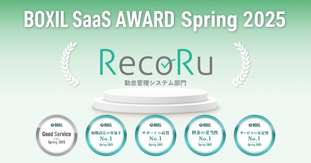 中央システム株式会社(本社:東京都新宿区、代表取締役社長:本間 匡、以下中央システム)が提供するクラウド勤怠管理システム「RecoRu(レコル)」は、スマートキャンプ株式会社(以下スマートキャンプ)が主催する「BOXIL SaaS AWARD Spring 2025」の勤怠管理システム部門で「Good Service」「初期設定の容易さNo.1」「サポートの品質No.1」「料金の妥当性No.1」「サービスの安定性No.1」に選出されました。