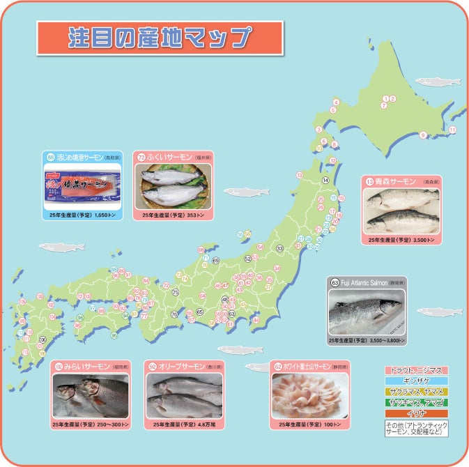 実は北海道から九州まで全国に生産地が広がっているサーモンの養殖 113のブランドや生産者名、生産量などを掲載したオリジナルマップ+オリジナルデータの最新版をリリース