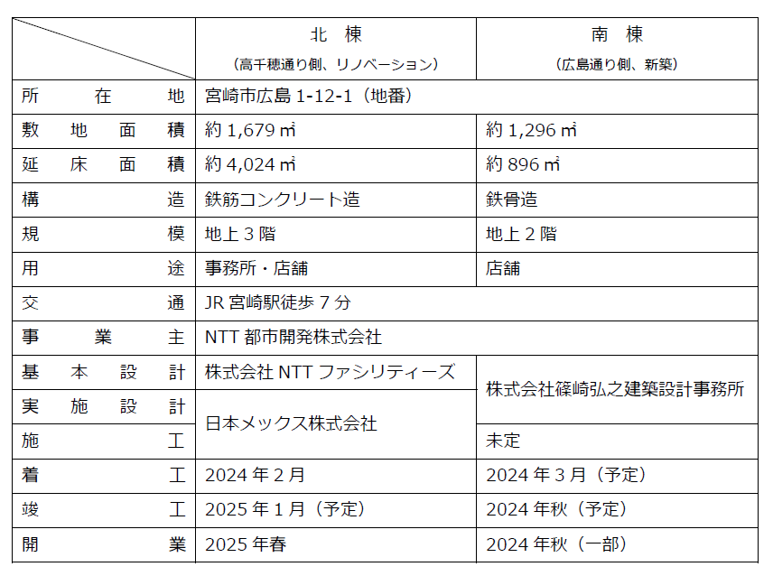 NTT都市開発株式会社(本社:東京都千代田区、代表取締役社長:辻󠄀上 広志)およびNTTアーバンソリューションズ株式会社(本社:東京都千代田区、代表取締役社長:辻󠄀上 広志)は、2022年12月23日に宮崎市及び西日本電信電話株式会社(以下、「NTT西日本」)宮崎支店と締結した「次世代型まちづくりの推進に関する連携協定」(以下、「連携協定」)に基づき、このたびNTT西日本宮崎支店敷地(宮崎市広島1丁目12-1)において宮崎市広島一丁目プロジェクト(以下、「本計画」)の第1弾となる、NTT広島ビル北棟(高千穂通り側)のリノベーション工事に着手しました。なお、開業は2025年春を予定しています。また、同敷地内南棟(広島通り側)については、2024年3月に新築工事着工、同年秋の一部先行開業を予定しており、詳細については決まり次第お知らせします。