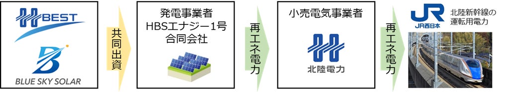 この取り組みは、ブルースカイソーラーグループが保守管理を行う太陽光発電所で発電された再生可能エネルギー由来電力(以下、再エネ電力)の全量を北陸電力が買い取り、西日本旅客鉄道株式会社の北陸新幹線の運転用電力として供給するものです。