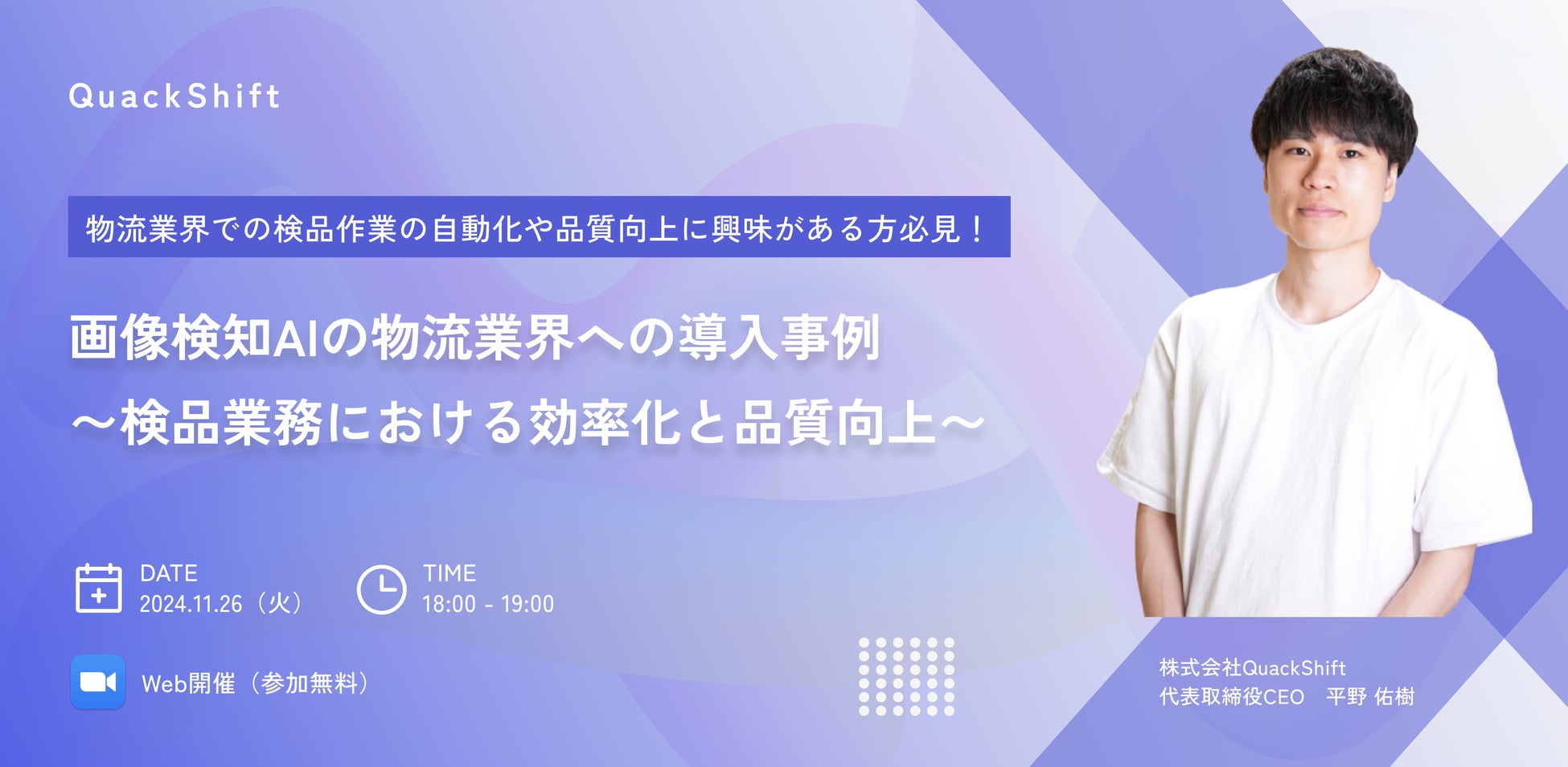 AIソリューション事業を展開する株式会社QuackShiftは、物流業界におけるAI導入をテーマにした無料オンラインセミナー「画像検知AIの物流業界への導入事例:検品業務における効率化と品質向上」を11月26日 (火)18時に開催いたします。