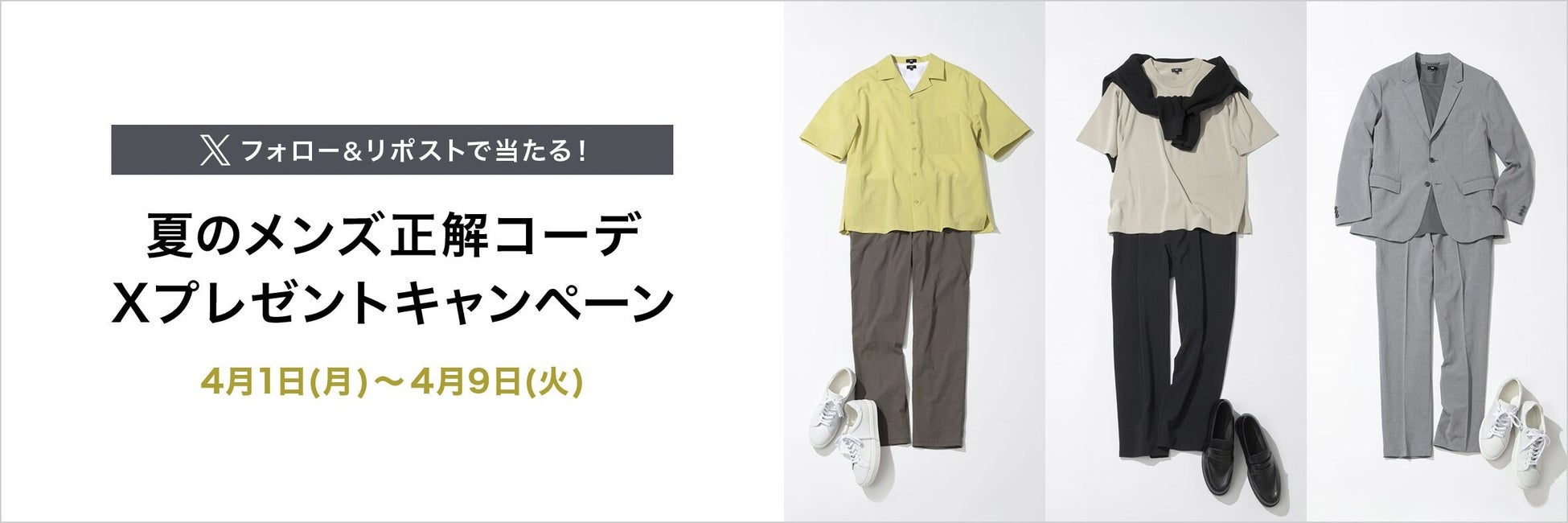 4月1日(月)の新商品発売に合わせて、「夏のメンズ正解コーデ プレゼントキャンペーン」を実施します。プラステの人気店長3名が「プレシャスドライ」シリーズのアイテムを使って、シーン別のおすすめコーディネートをキャンペーン特設サイトにてご紹介いたします。プラステ公式Xアカウントをフォローし、希望のコーディネートとサイズを引用リポストした方の中から、抽選で30名様に希望のコーディネートを一式(シューズは除く)プレゼントいたします。