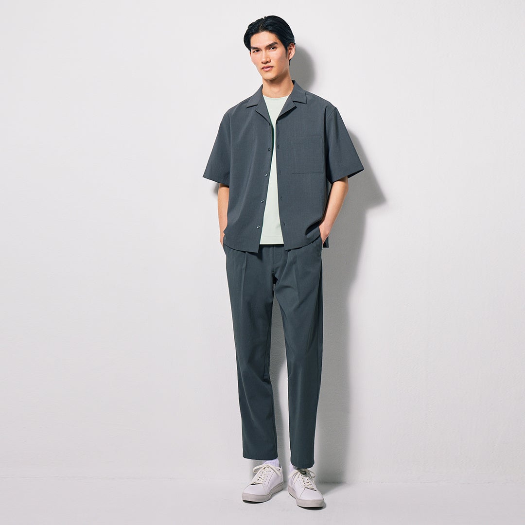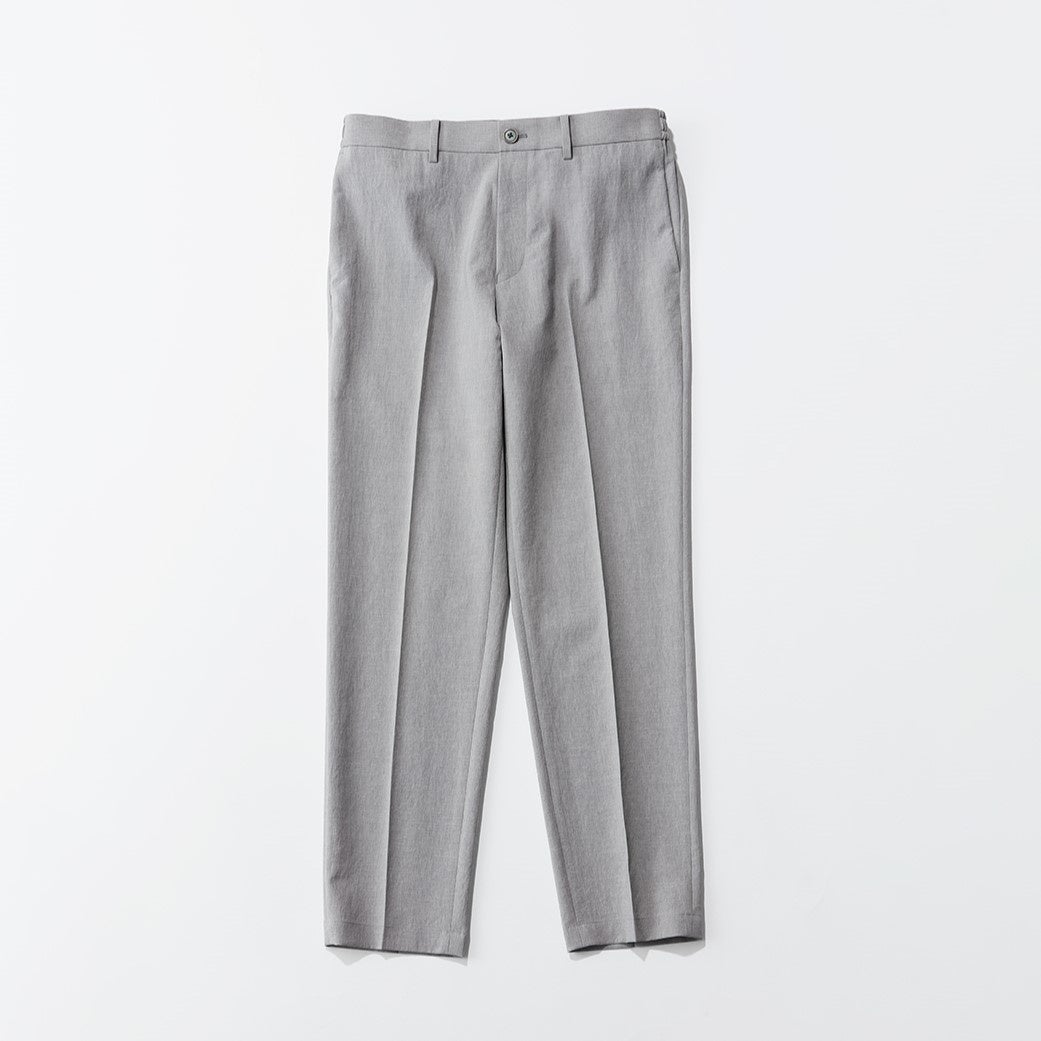 スリムテーパードシルエットのトラウザーズは、同素材のジャケットやシャツとセットアップで着るのがおすすめ。パンツ丈が長いTALLサイズも展開。