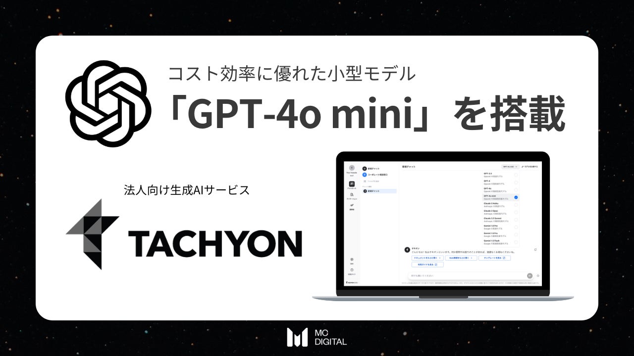 テクノロジーをもって企業の課題解決を支援するエムシーデジタル株式会社(本社:東京都千代田区、代表取締役社長:河内 伸学)は、同社が開発を進めるGPT/Gemini/Claudeの複数LLM利用が可能な法人向け生成AIサービス「Tachyon 生成AI」に、最新の大規模言語モデル(以下LLM:Large Language Models)である「GPT-4o mini」を搭載しました。