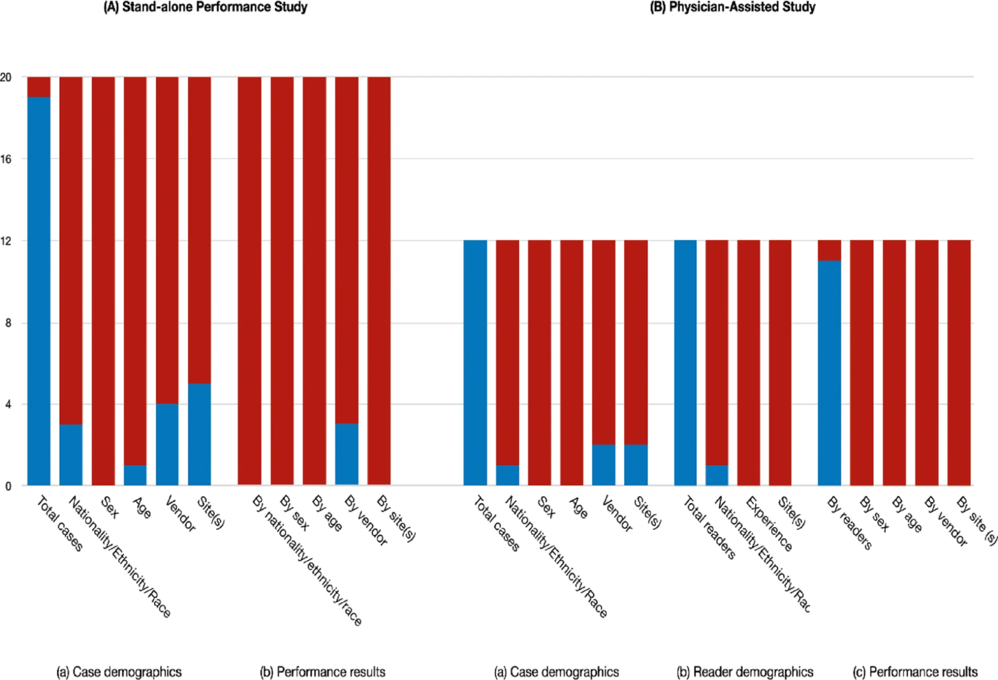 単体性能試験(A)および医師支援試験(B)それぞれについて、症例の患者背景情報、読影医の属性情報、ならびに性能評価結果の記載状況を示している。青色は該当情報が添付文書上で確認された製品数、赤色は記載が確認されなかった製品数を表す。