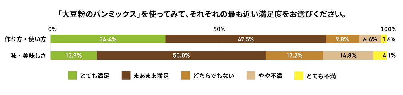 「作り方・使い方」と「味・美味しさ」の満足度を5段階で調査したところ「作り方・使い方」は83%が満足とする一方、「味・美味しさ」は64%が満足という結果でした。大豆粉の味や風味は好みで評価もわかれるところですが、小麦粉よりも難しいとされる大豆粉で「作り方・使い方」の高評価を得られた点は今後の可能性を示す結果になったとみています。