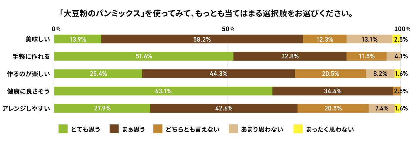 料理SNS「スナップディッシュ」を運営するスナップディッシュ株式会社(本社:東京都武蔵野市、代表取締役:舟田善)協力のもと、同アプリのユーザーを対象に発売前の「大豆粉のパンミックス」でテストモニターを実施しました。モニターユーザーの約40%が週1回以上、75%が月1回以上パンを手作りすると回答。日常的にパンを手作りをされている方を対象にしました。味や手軽さ、栄養面について「とても思う」~「まったく思わない」の5段階から回答を集めた結果、「とても思う」「思う」を足した回答の最多は「健康に良さそう」(98%)、次いで「手軽に作れる」(84%)、「美味しい」(72%)という結果でした。