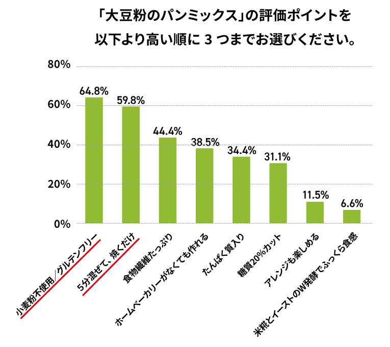 「大豆粉のパンミックス」の評価ポイントでは、糖質カットやたんぱく質をおさえて「小麦粉不使用/グルテンフリー」、「5分混ぜて焼くだけ」の2項目が60%を超えました。