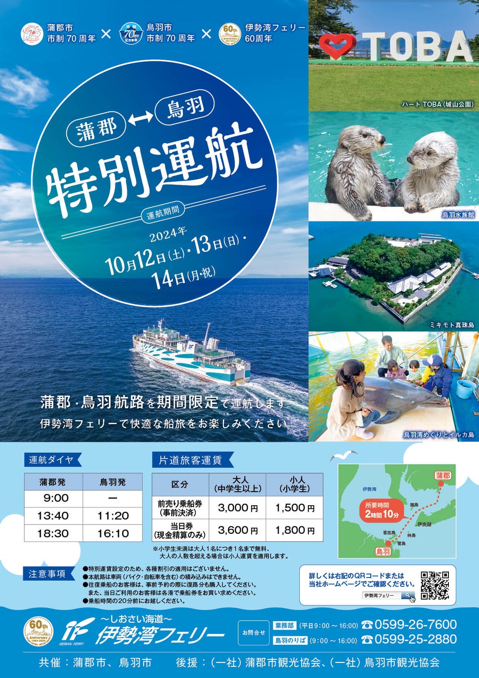 蒲郡市市政70周年×鳥羽市市政70周年×伊勢湾フェリー60周年を記念して、かつて蒲郡竹島埠頭から発着していた蒲郡鳥羽航路を3日間限定で特別運航いたします。普段乗船することができない航路を利用し、蒲郡市と鳥羽市両地域の観光と船旅をお楽しみください。