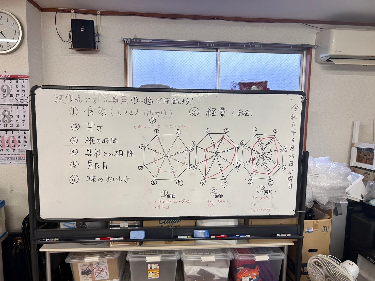 そこで先生から、「仮説→実験(試作)→結果→検証(フィードバック)が大事だよ!」と教えてもらいました。それから、おいしさや甘さ、焼き加減、食感などを細かく評価して、前の試作と何を変えたのか、その結果どうなったのかをしっかり検証するようになりました🔍