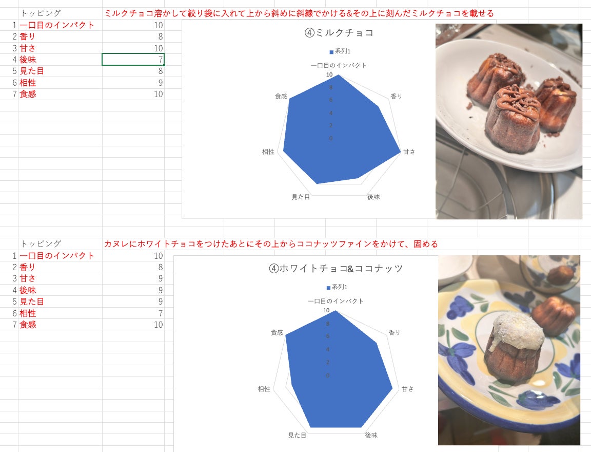 そして、百貨店のお店のカヌレを5種類、試食し、評価と検証を重ねました。