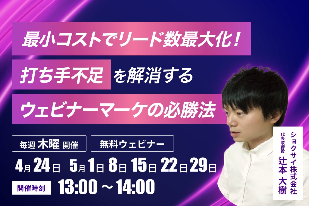 ショクサイ株式会社(代表取締役:辻本 大樹)は4月24日(木)13時よりBtoBマーケティング担当者向けに「最小コストでリード数最大化!打ち手不足を解消するウェビナーマーケの必勝法」を開催いたします。