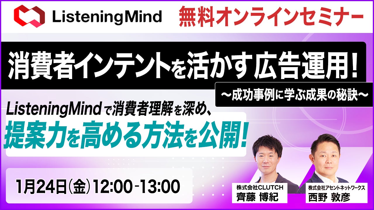 株式会社アセントネットワークス(本社:東京都中央区、代表取締役:金志勲)は、検索データを統合的に分析して消費者のインテントを可視化するデスクリサーチツール「Listening Mind (リスニングマインド、以下Listening Mind) 」( URL: https://www.listeningmind.com/ja/ )を使用して、広告運用を行う株式会社クラッチ様のマーケティング担当者と共同で活用事例紹介セミナーを2025年1月24日(金)12:00~13:00にオンライン開催すると発表しました。
