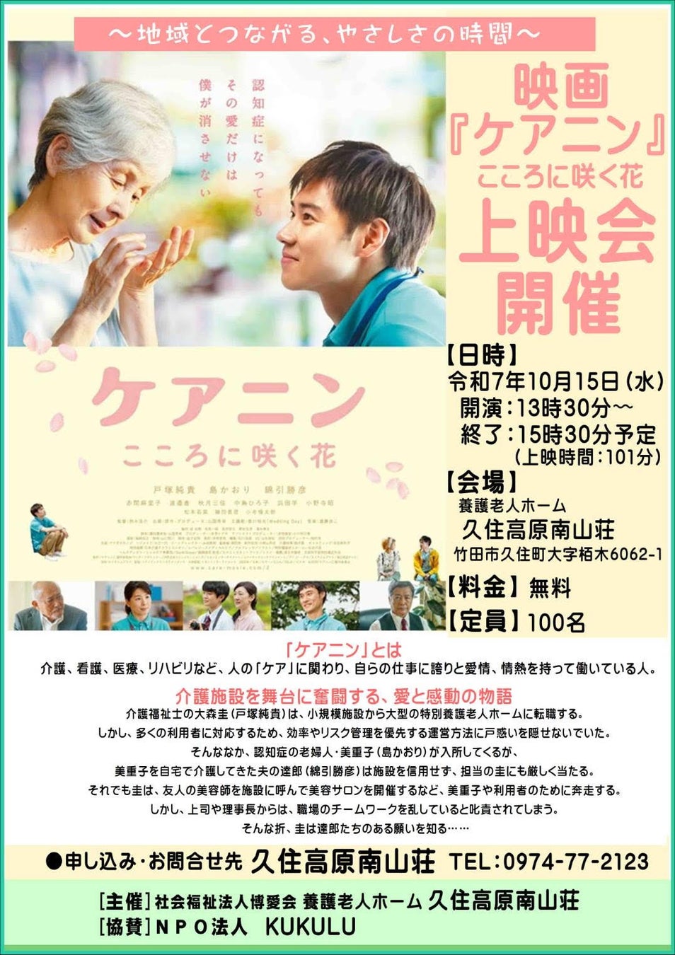 社会福祉法人博愛会(所在地:大分県大分市/理事長:釘宮卓司)は、養護老人ホーム「久住高原南山荘」(大分県竹田市久住町大字栢木6062−1)にて、映画『ケアニン~こころに咲く花~』の上映会を開催いたします。