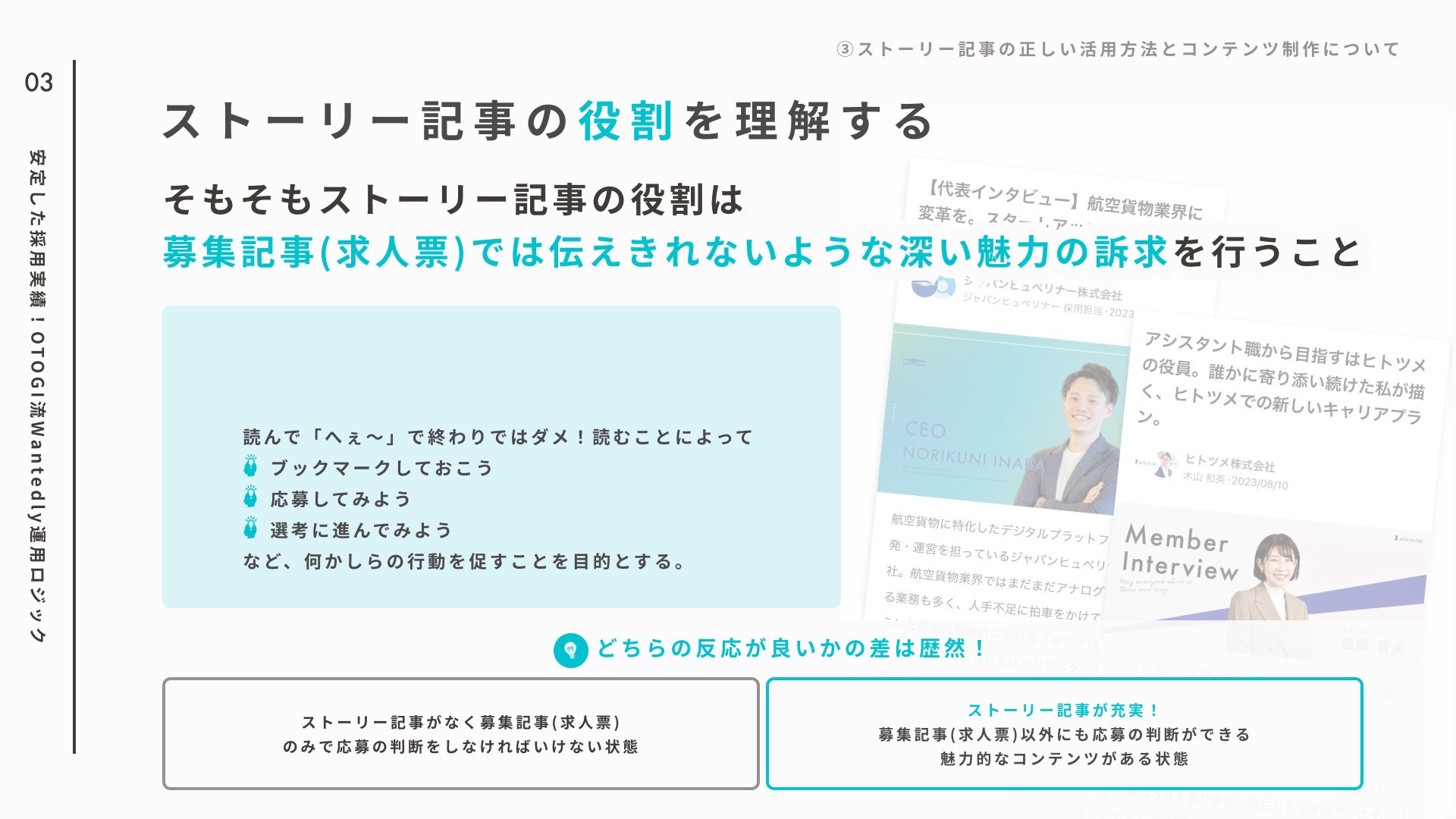 Wantedlyという採用サービスは自社の勝ちパターンを見つけることで、「採用単価の大幅減少」「運用工数の最小化」「採用広報コンテンツの資産化」などの複数の効果を狙えるサービスだと認識しています。ですので、本資料では「中長期で使い続けるための本質的なWantedly運用術」の解説をしています。